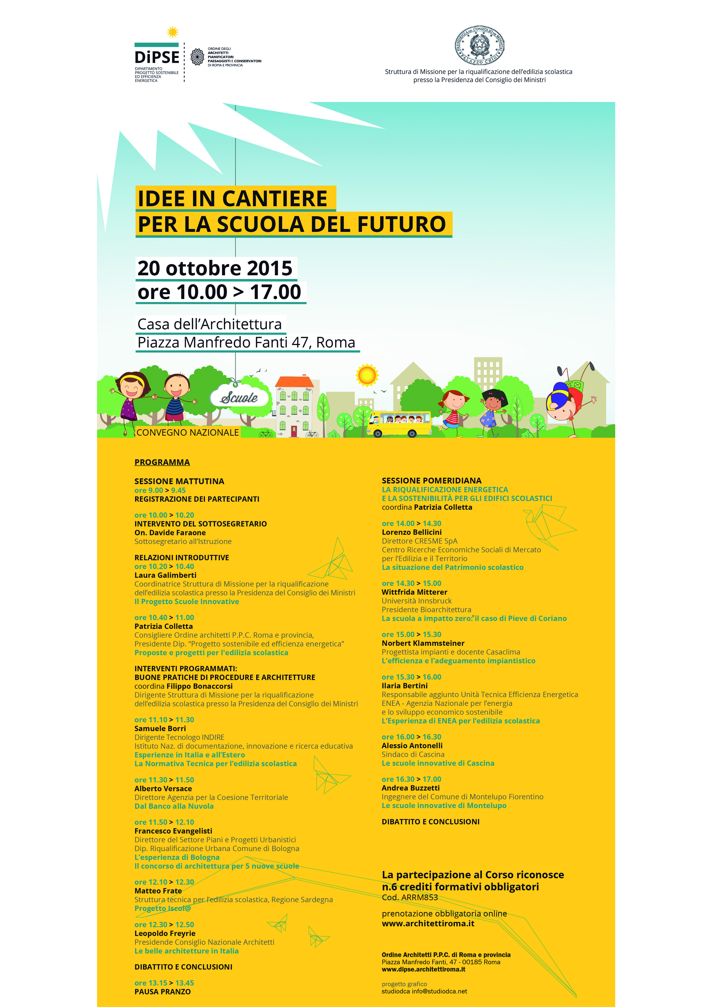 IL PROGRAMMA e i TEMI. In apertura interverranno Davide Faraone, Sottosegretario del Miur, Laura Galimberti (Struttura di missione per l’edilizia scolastica) e Patrizia Colletta, consigliere dell’Ordine degli architetti di Roma Roma e Presidente del Dipartimento “Progetto sostenibile ed efficienza energetica”.