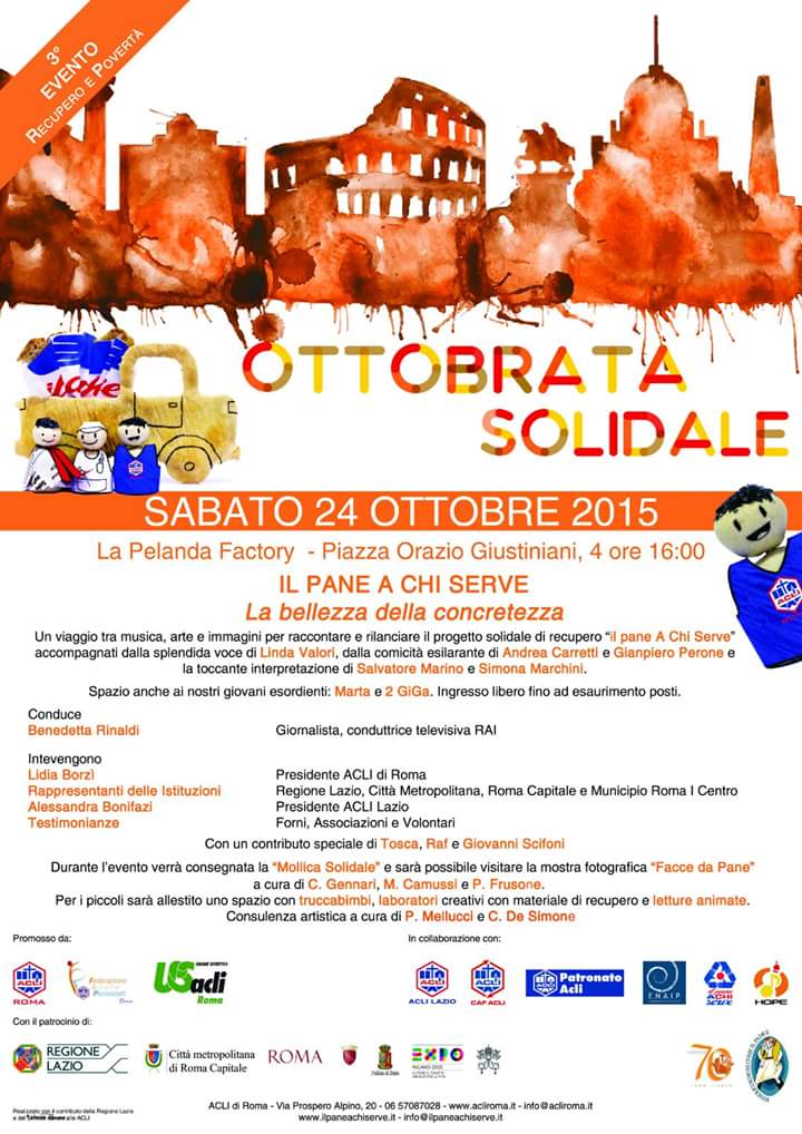 Sabato 24 Ottobre 2015 alle ore 16.00 – presso La Pelanda – Factory – Piazza Orazio Giustiniani, 4 per condividere un percorso che coniuga la restituzione dei significativi risultati del progetto “Il Pane a chi serve” con uno spettacolo tra arte, immagini, musica e parole alla presenza di artisti e volti noti e per raccontare la bellezza della solidarietà e la concretezza del dono a chi ha bisogno.
