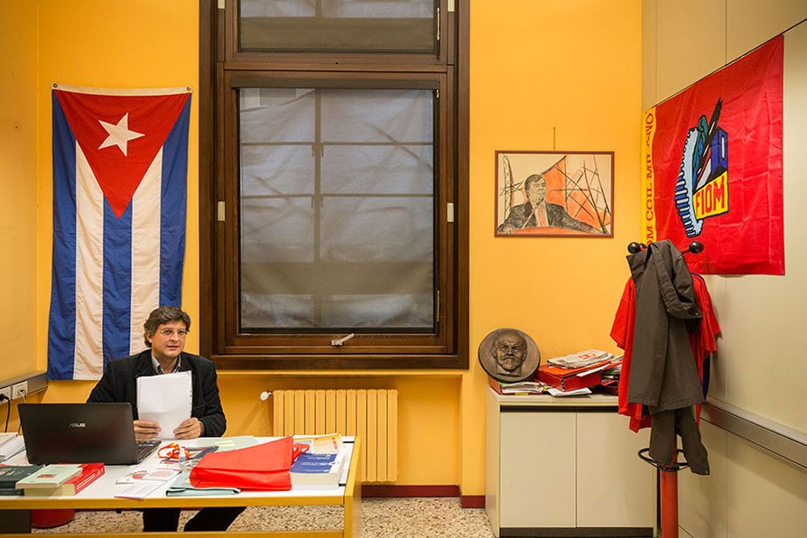Milano: la sede della Fiom al primo piano della Camera del Lavoro, con bandiera di Cuba e bassorilievo di Lenin. Foto di Lorenzo Palmieri