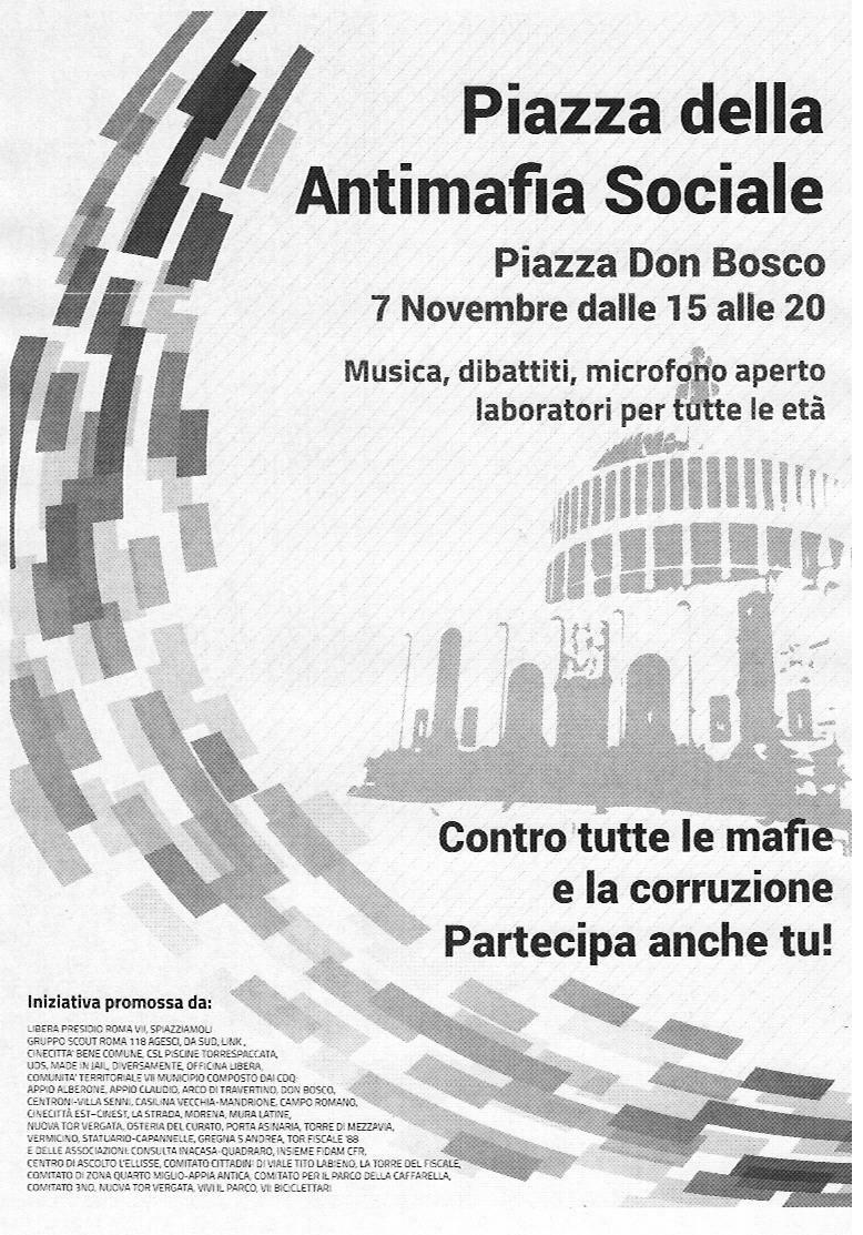 Le associazioni e i Comitati del VII Municipio si stanno impegnando per organizzare un grande evento di “antimafia sociale” per sabato 7 novembre (2 giorni dopo l’inizio del processo per Mafia Capitale) in Piazza Don Bosco. Piazza dell’Antimafia Sociale. Dalle 15 alle 20 e oltre la cittadinanza si riappropria di una piazza, diventata simbolo negativo causa il funerale dei Casamonica, portando tutte le pratiche di antimafia che nel Municipio (e nella città) praticano quotidianamente. Il VII municipio e Roma non possono essere associati né ai Casamonica né a manifestazioni estemporanee. Non saranno presenti partiti ma solo i cittadini e le loro associazioni.